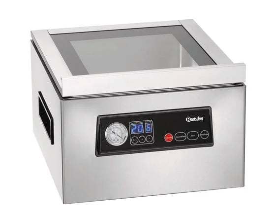 Garder un oeil sur tout : l'appareil de mise sous vide à compartiment est équipé d'un couvercle en verre et d'un manomètre pour surveiller la dépression. Un étrier de serrage dans le compartiment empêche le sachet sous vide de glisser.
