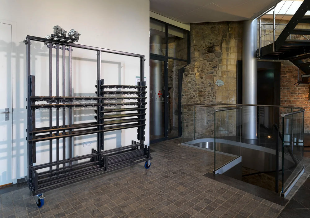 Il s’agit d’un chariot de transport unique, introuvable ailleurs. Ce chariot a été conçu exclusivement pour ces portants de vestiaire. Il peut accueillir au maximum 10 grands portants de vestiaire de 2 mètres. Cela correspond à 1040 crochets pouvant être stockés au maximum. De plus, il est bien entendu également possible de transporter la variante 1 mètre avec ce chariot de transport.