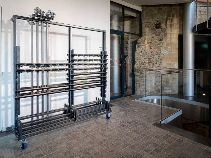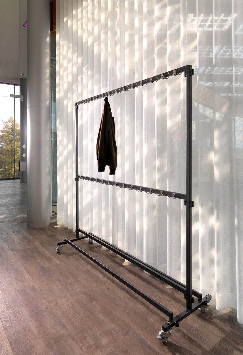 Le porte-manteaux de 2 mètres de long est parfaitement adapté pour suspendre un grand nombre de vestes et de manteaux. Cette version dispose de 104 crochets, est mobile sur roulettes et peut être immobilisée grâce aux freins des roulettes. Ce porte-manteaux démontable convient très bien aux grandes salles où les vestiaires doivent être empilés rapidement et efficacement. Le porte-manteaux possède des points de connexion permettant de le relier à d’autres porte-manteaux. Ainsi, des salles entières peuvent être aménagées rapidement et facilement. Le porte-manteaux est démontable de façon à ce que toutes les pièces puissent être placées sur le chariot de transport conçu à cet effet.