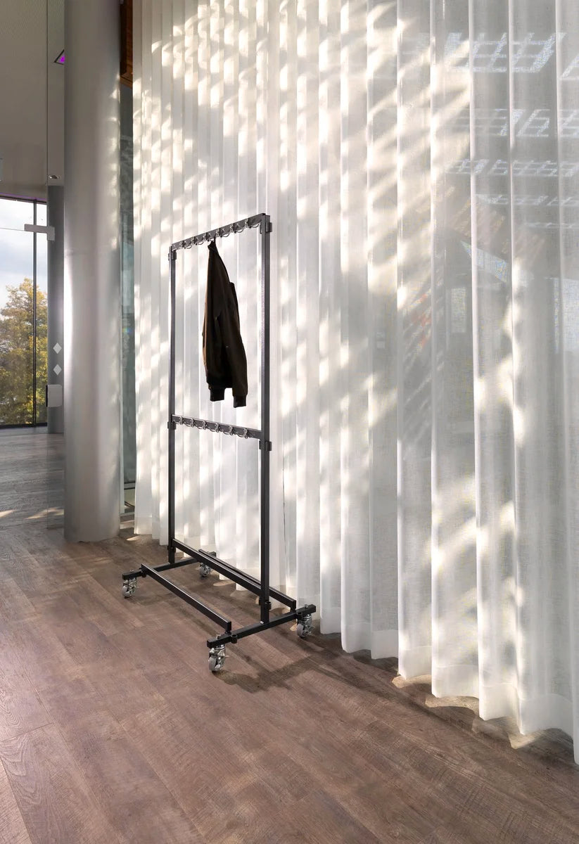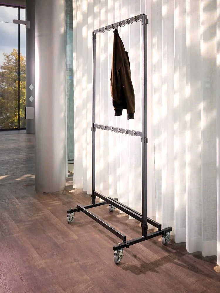 Le porte-manteaux d’1 mètre de long est parfaitement adapté pour suspendre un grand nombre de vestes et de manteaux. Cette version dispose de 48 crochets, est mobile sur roulettes et peut être immobilisée grâce aux freins des roulettes. Ce porte-manteaux démontable convient très bien aux grandes salles où les vestiaires doivent être empilés rapidement et efficacement. Le porte-manteaux possède des points de connexion permettant de le relier à d’autres porte-manteaux. Ainsi, des salles entières peuvent être aménagées rapidement et facilement. Le porte-manteaux est démontable de façon à ce que toutes les pièces puissent être placées sur le chariot de transport conçu à cet effet.