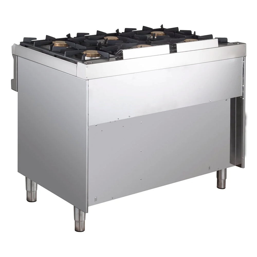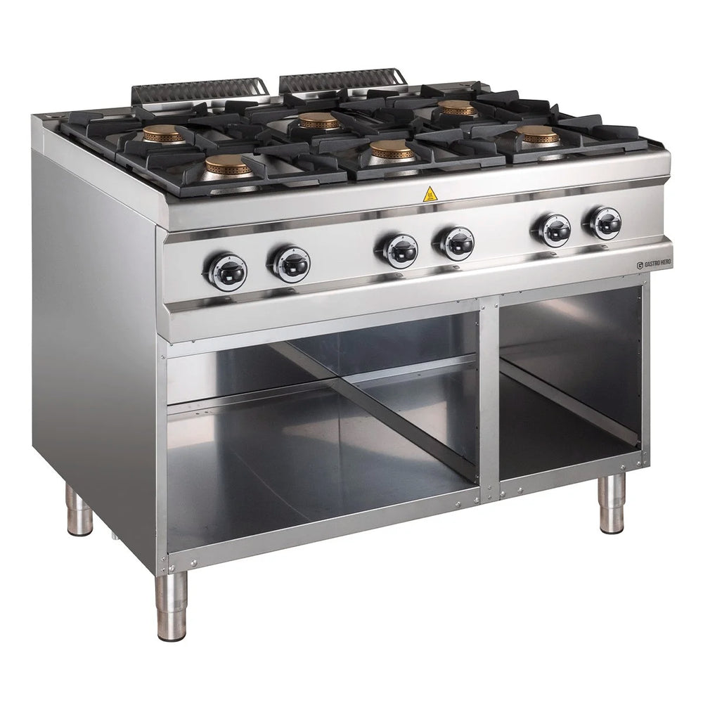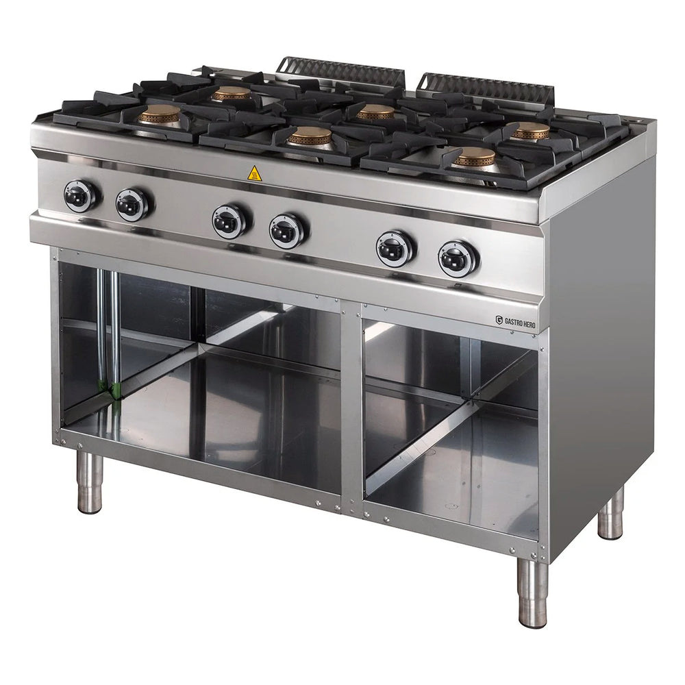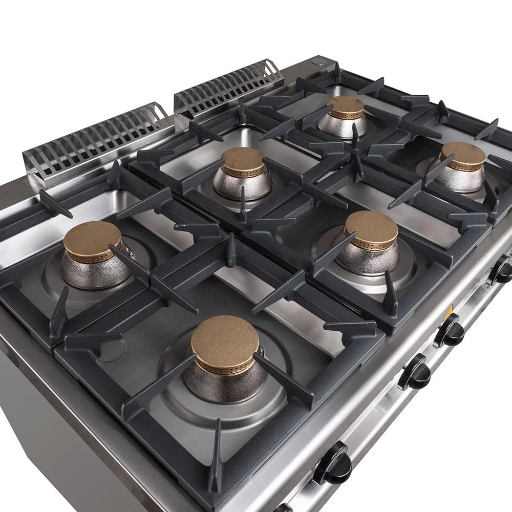 Cuisinière pro à gaz inox - 6 brûleurs - sur meuble ouvert - 110 x 70 cm - 42 kw - série 77