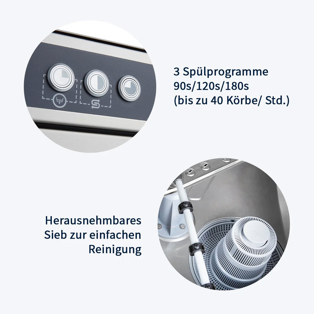 - Des résultats impeccables grâce à deux programmes de lavage de 1,5 à 3 min. pour jusqu'à 40 casiers/heure