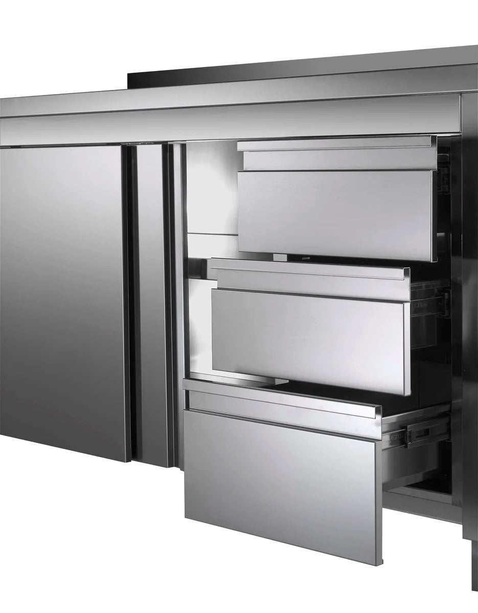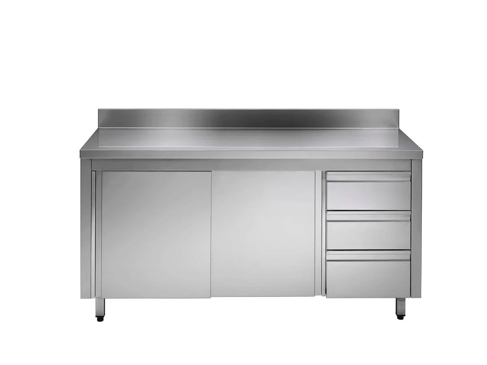 Meuble bas adossée en inox ECO à portes battantes et 3 tiroirs 14x6