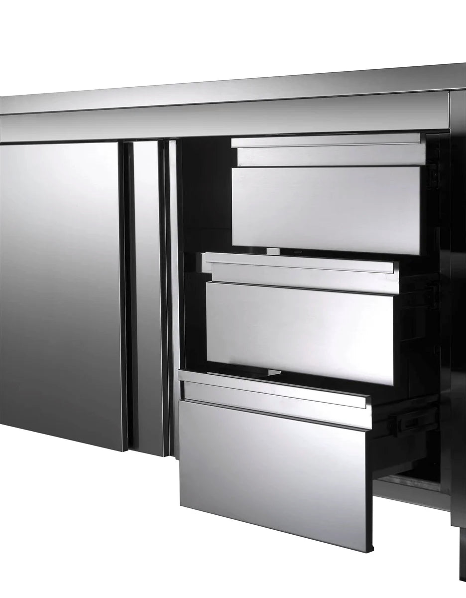 Les armoires de rangement ECO sont entièrement fabriquées en acier chromé Scotchbrite de qualité supérieure et livrées intégralement montées. La sous-plaque renforcée imperméable et à isolation phonique confère à nos armoires de rangement une solidité et une durabilité incomparables. Une étagère intermédiaire réglable en hauteur offre un espace de rangement individuel et optimal.
