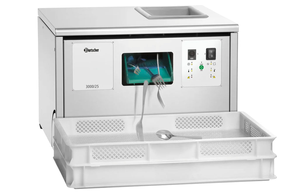 Avec la polisseuse à couverts 3000/25 de Bartscher, vos couverts seront étincelants. Grâce à la lampe UV intégrée et à la température de fonctionnement conforme aux normes HACCP, elle peut désinfecter jusqu'à 3000 couverts par heure selon une hygiène stricte.