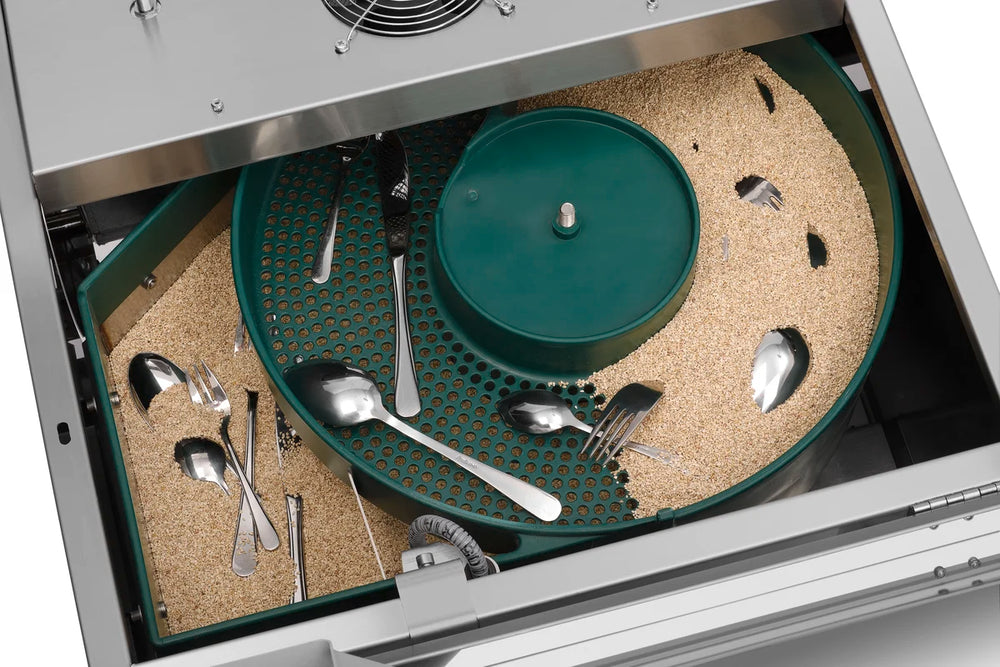 - Les couverts sont déplacés par vibration et sont polis par les granulés de maïs