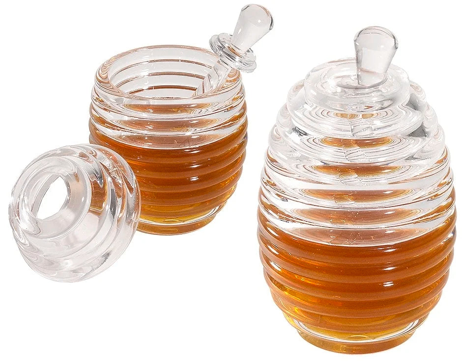 Pot de miel décoratif pour votre buffet. La livraison comprend un bâton doseur et un couvercle. En acrylique en forme de ruche, ne va pas au lave-vaisselle.