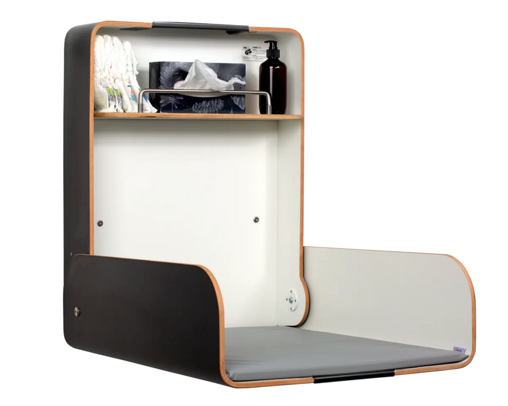 La table à langer KAWAmidi Anthra convainc notamment grâce à ses dimensions étroites et convient ainsi parfaitement pour un montage dans des petites pièces. À l'état plié, elle occupe seulement une profondeur de 220 mm. Ouverte, ses protections latérales de 200 mm de haut protègent l'enfant contre la chute de manière optimale.