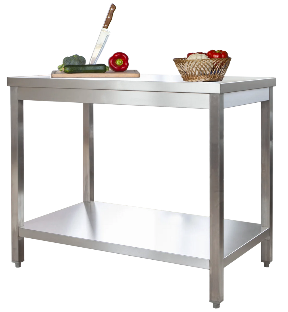DESCRIPTION DE L'ARTICLELes tables de travail en inox de qualité supérieure avec étagère basse et sans dosseret de la série PROFI sont nos tables de travail les plus vendues. Elles sont fabriquées en inox 1.4301 de haute qualité et se caractérisent par une capacité de charge élevée. Caractéristiques du produit : - Avec étagère basse