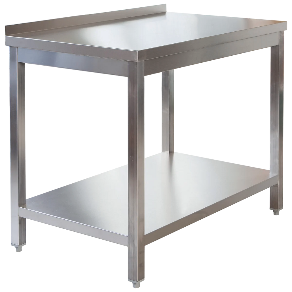 DESCRIPTION DE L'ARTICLELes tables de travail en inox de qualité supérieure avec étagère basse et dosseret de la série PROFI sont nos tables de travail les plus vendues. Elles sont fabriquées en inox 1.4301 de haute qualité et se caractérisent par une capacité de charge élevée. Caractéristiques du produit : - Avec dosseret 40 mm