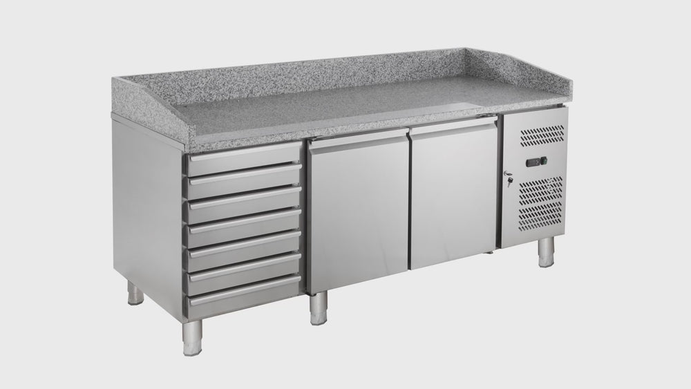 Table à pizza réfrigérée inox - 202,5 cm - 2 portes 7 tiroirs - 390 L - froid ventilé - plan granit