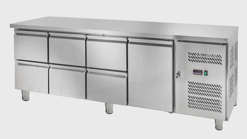Nos tables réfrigérées de la série ECO séduisent par leur design moderne, leur grande fonctionnalité et leur construction particulièrement robuste. Grâce à la plage de température idéale de -2°C à +8°C, vous pouvez conserver vos aliments au frais de manière optimale. Le thermostat électronique avec écran LED vous facilite l'utilisation et assure en même temps une température de réfrigération individuelle et exacte.