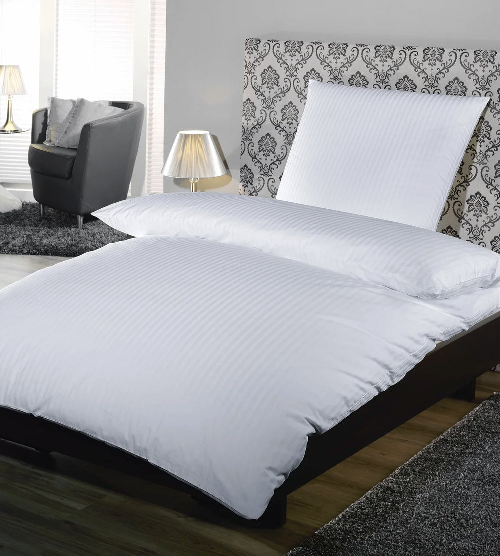 Ce luxueux linge de lit en satin, fabriqué en pur coton et doté de fines rayures, offre à vos invités un confort de sommeil de rêve. Ce linge de lit est particulièrement résistant et répond parfaitement aux exigences élevées de l'industrie hôtelière.