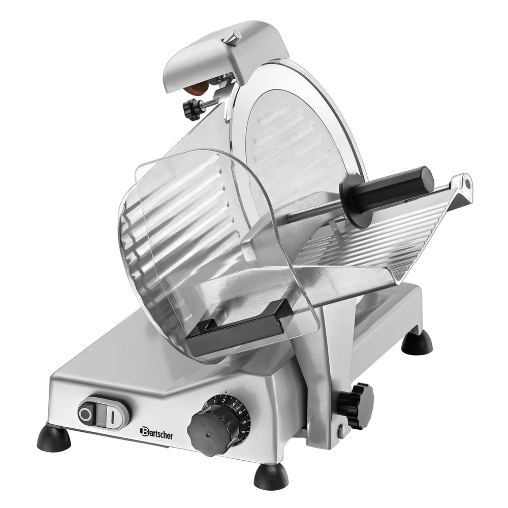L’équipement de la trancheuse optimisée avec une lame de 275 mm convainc à plusieurs niveaux grâce à ses fonctionnalités techniques. La puissante trancheuse inclinée / trancheuse à gravité dispose d’un pousse-restes, d’un aiguiseur de lame, d’un guide de tranchage et, pour garantir la sécurité, d’un protège-lame double ainsi que d’un interrupteur magnétique.