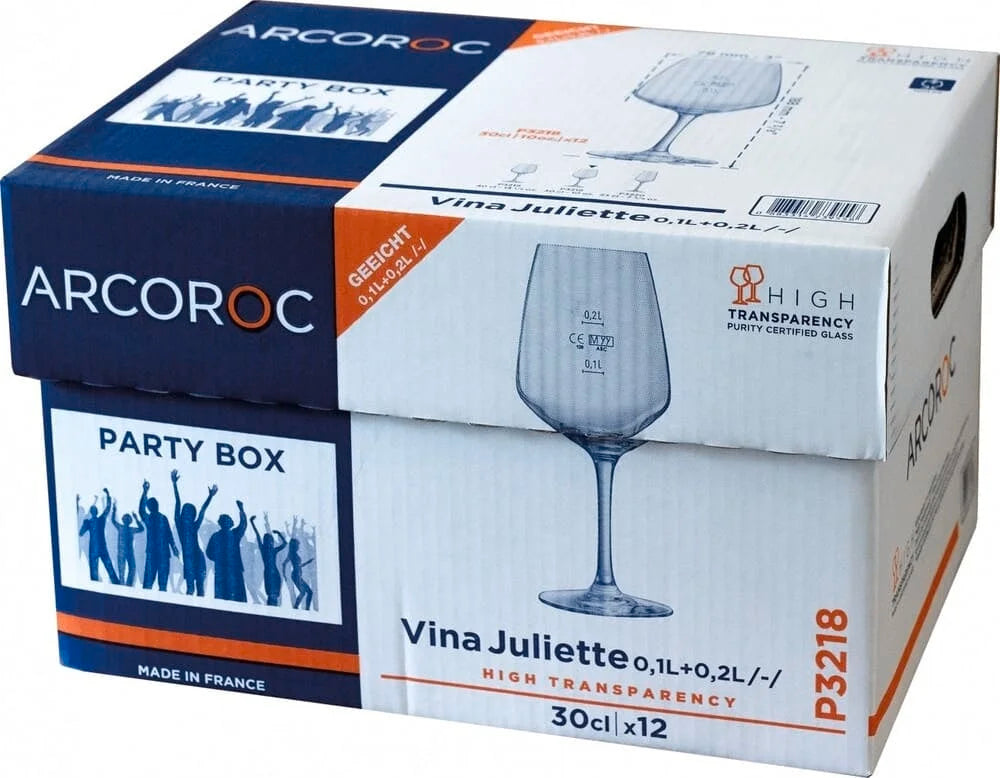 Verre à vin Arcoroc V. Juliette, 30 cl avec repères de remplissage à 0,1 et 0.2 l, Party Box de 12 pièces