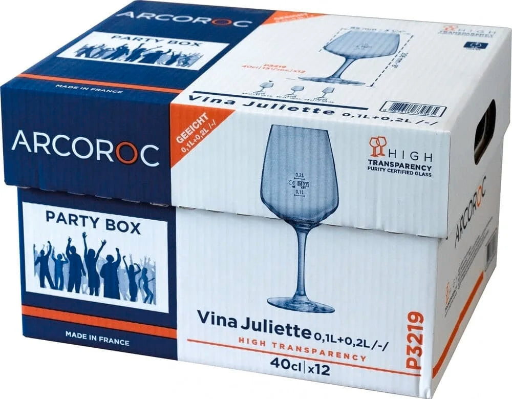 Verre à vin Arcoroc V. Juliette, 40 cl avec repères de remplissage à 0,1 et 0.2 l, Party Box de 12 pièces