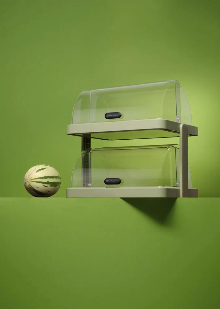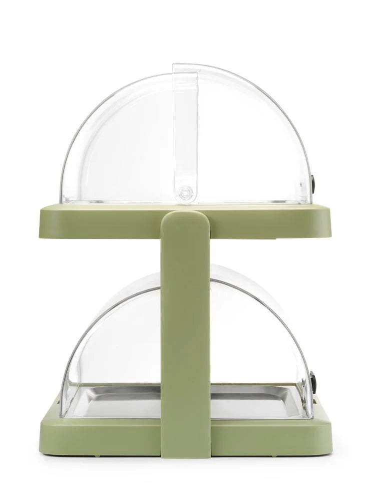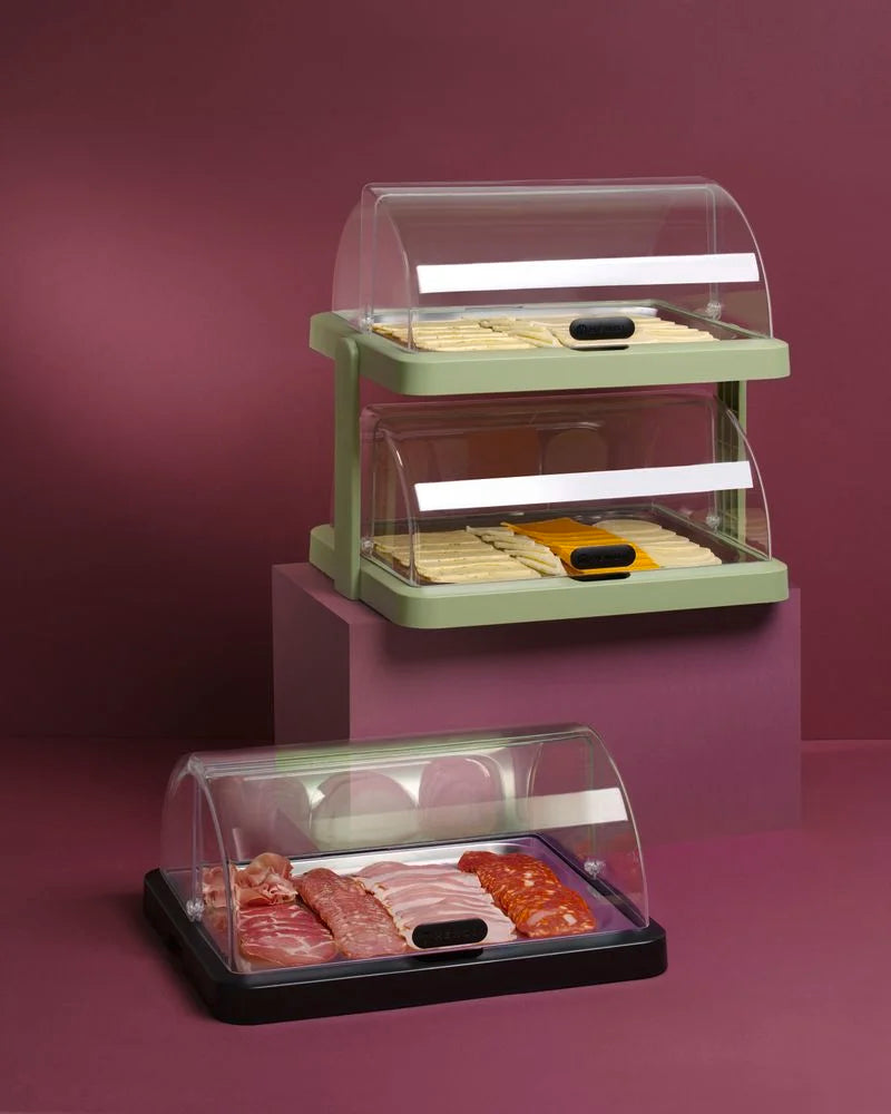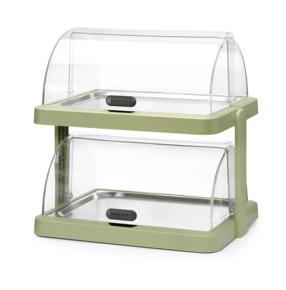 Le présentoir réfrigéré à double couvercle roulant Duo UNIQ de HENDI en vert, conçu par Robert Bronwasser, allie fonctionnalité et design pour une présentation moderne des aliments. L’unité à deux niveaux est parfaite pour les buffets et maintient les plats au frais plus longtemps grâce aux accumulateurs de froid intégrés. Grâce à sa conception verticale, ce présentoir libère de l’espace sur le buffet tout en garantissant une présentation hygiénique et attrayante.