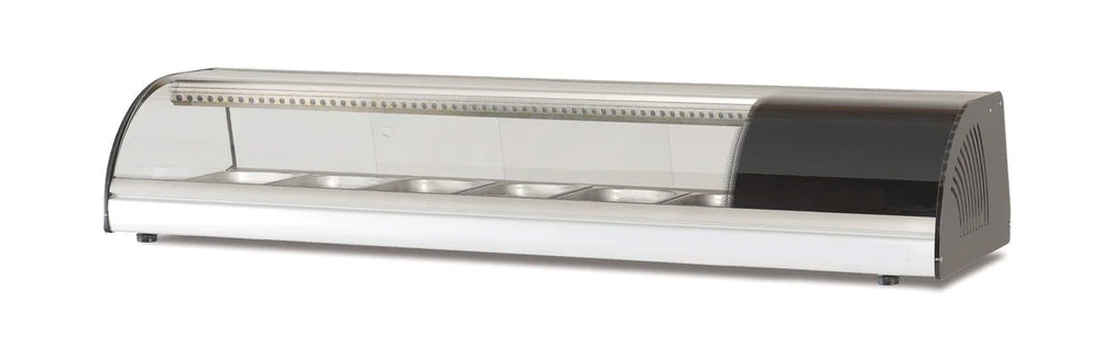Grâce à leur vitre avant bombée, les vitrines réfrigérées à sushi de la gamme PROFI se prêtent parfaitement à la vente et à la présentation de sushis. Le réapprovisionnement s'effectue par les portes coulissantes à l'arrière et l'éclairage intérieure à LED permet d'attirer l'attention des clients sur la marchandise. La vitrine est en acier au chrome-nickel et la vitre avant est composée de verre de sécurité trempé.Caractéristiques du produit :