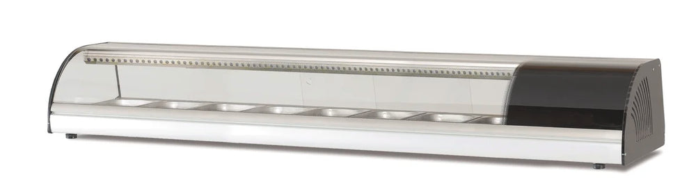 Grâce à leur vitre avant bombée, les vitrines réfrigérées à sushi de la gamme PROFI se prêtent parfaitement à la vente et à la présentation de sushis. Le réapprovisionnement s'effectue par les portes coulissantes à l'arrière et l'éclairage intérieure à LED permet d'attirer l'attention des clients sur la marchandise. La vitrine est en acier au chrome-nickel et la vitre avant est composée de verre de sécurité trempé.Caractéristiques du produit :